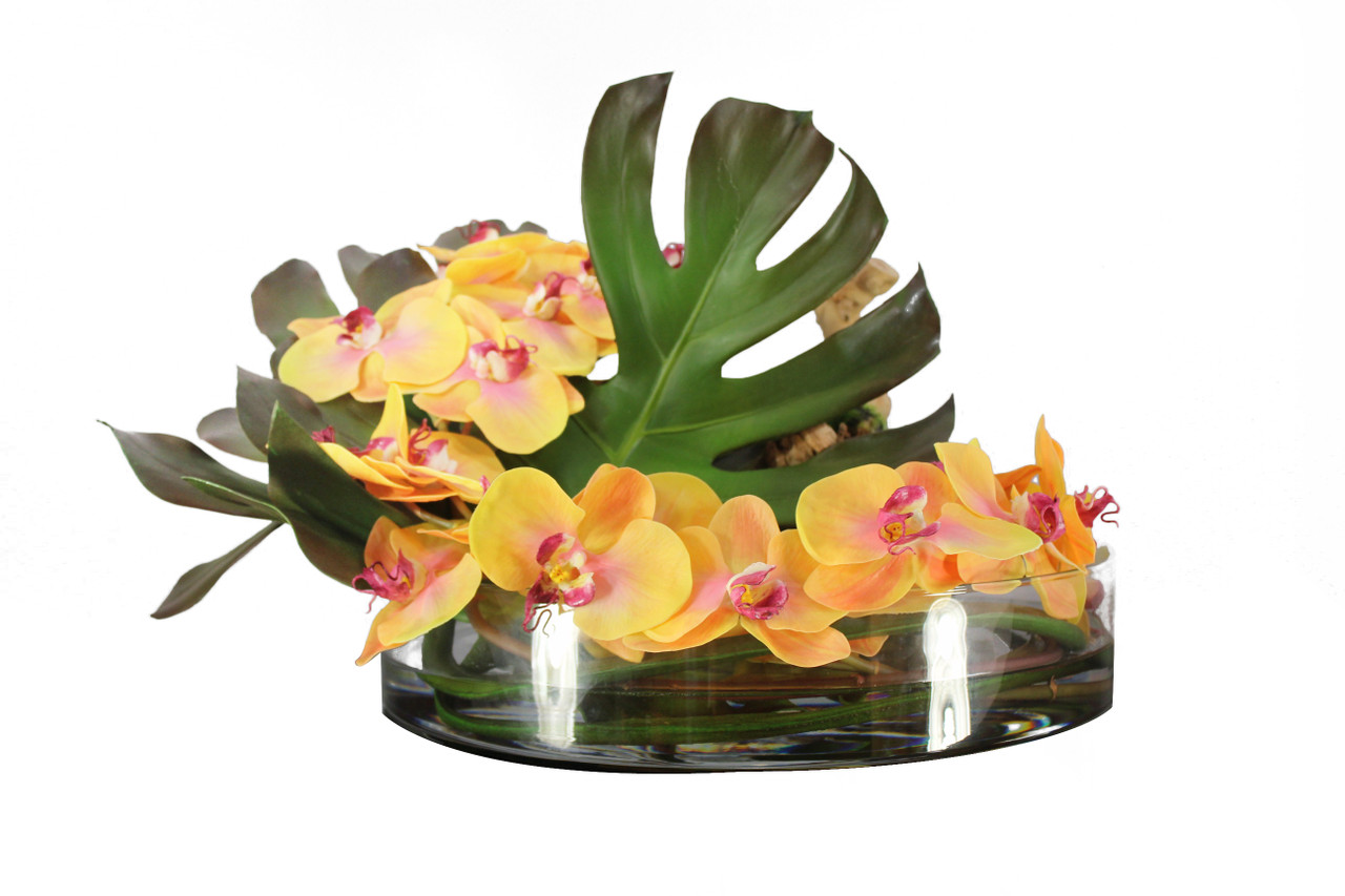 16″ Heritage bowl with a Monstera leaves, multiple stems of mango Phalaenopsis orchids and grape wood anchored in our illusion .