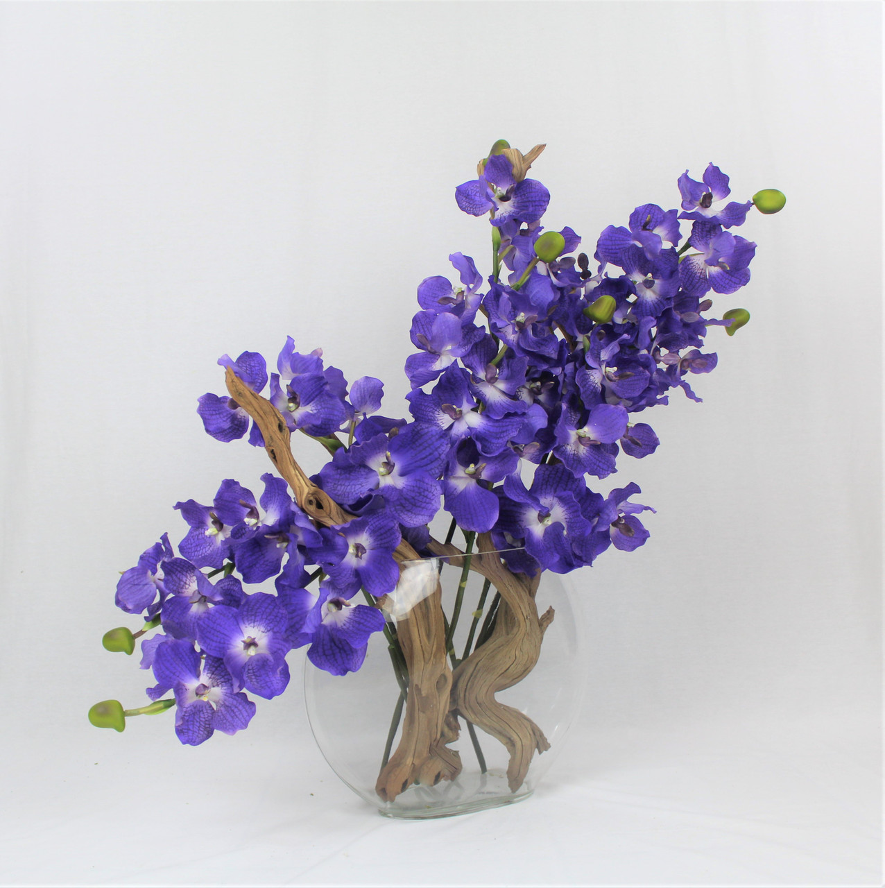 Moon vase 16″ with multiple stems of purple Vanda orchids and sandblasted ghost wood anchored in our illusion water.