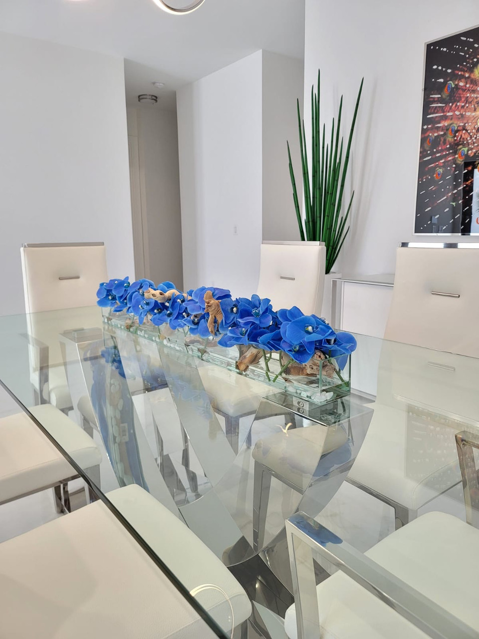 36″ Casa Moderna Glass Plate planter with blue Phalaenopsis orchids, sandblasted grape wood, white stones and our illusion water. The stunning sight of a Phalaenopsis orchids in full bloom is nothing less than breathtaking. Their huge, curving petals; double rows of gorgeous blooms march along our casa moderna glass plate planter. This translucent modern glass planter features 90 degree angles and a modern linear design. The sight of a massed display of Phalaenopsis orchids is so arresting that we have paired it with natural sandblasted grape wood to achieve a beautiful and organic contrast.
