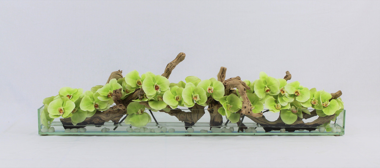 48″ Casa Moderna Glass Plate planter with green Phalaenopsis orchids, sandblasted grape wood, white stones and our illusion water. The stunning sight of a Phalaenopsis orchids in full bloom is nothing less than breathtaking. Their huge, curving petals; double rows of gorgeous blooms march along our casa moderna glass plate planter. This translucent modern glass planter features 90 degree angles and a modern linear design. The sight of a massed display of Phalaenopsis orchids is so arresting that we have paired it with natural sandblasted grape wood to achieve a beautiful and organic contrast..