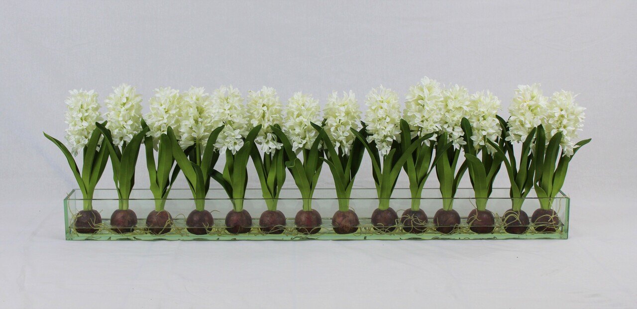 Casa Moderna glass plate planter 48″ with white hyacinth flowers and bulbs anchored in our illusion water.