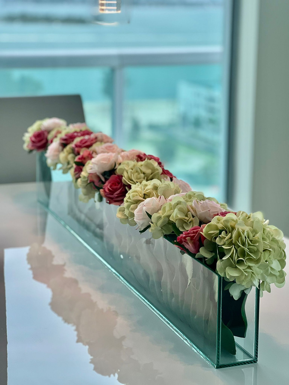 Our stylish skinny 36″ or 48″ Casa Moderna vase set with green hydrangeas, dark and blush roses is wrapped exquisitely with monstera leaves. This is truly a splendid arrangement. Imagine a burst of springtime with variations of rich green and pink colors handcrafted into bouquet perfection. This design is ideal as a house gift, decorations for the dinner table as friends and family gather during Spring or any holiday season or simply to brighten up your home or office.