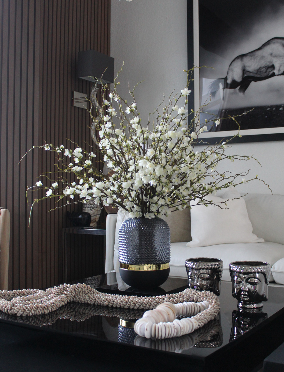 This large-scale cherry blossom flower arrangement makes a stunning dining table centerpiece; it also looks fabulous in an entryway or on a sofa or console table.