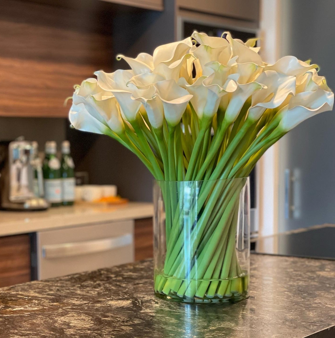Faux calla lily bouquet, wrapped together and arranged in a round glass cylinder vase