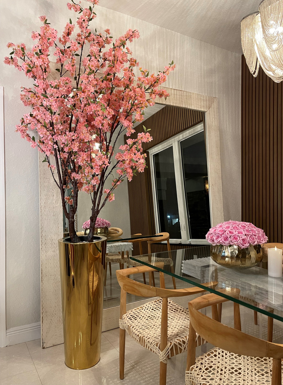 Cherry blossoms are a symbolic flower of the spring, a time of renewal, and the fleeting nature of life. Anchored in our signature Pure Gold collection high gloss stainless steel 34″ cone, these stunning, life like state of the art cherry blossoms will transform any room in your home. Refresh and renew your space with these beauties.
