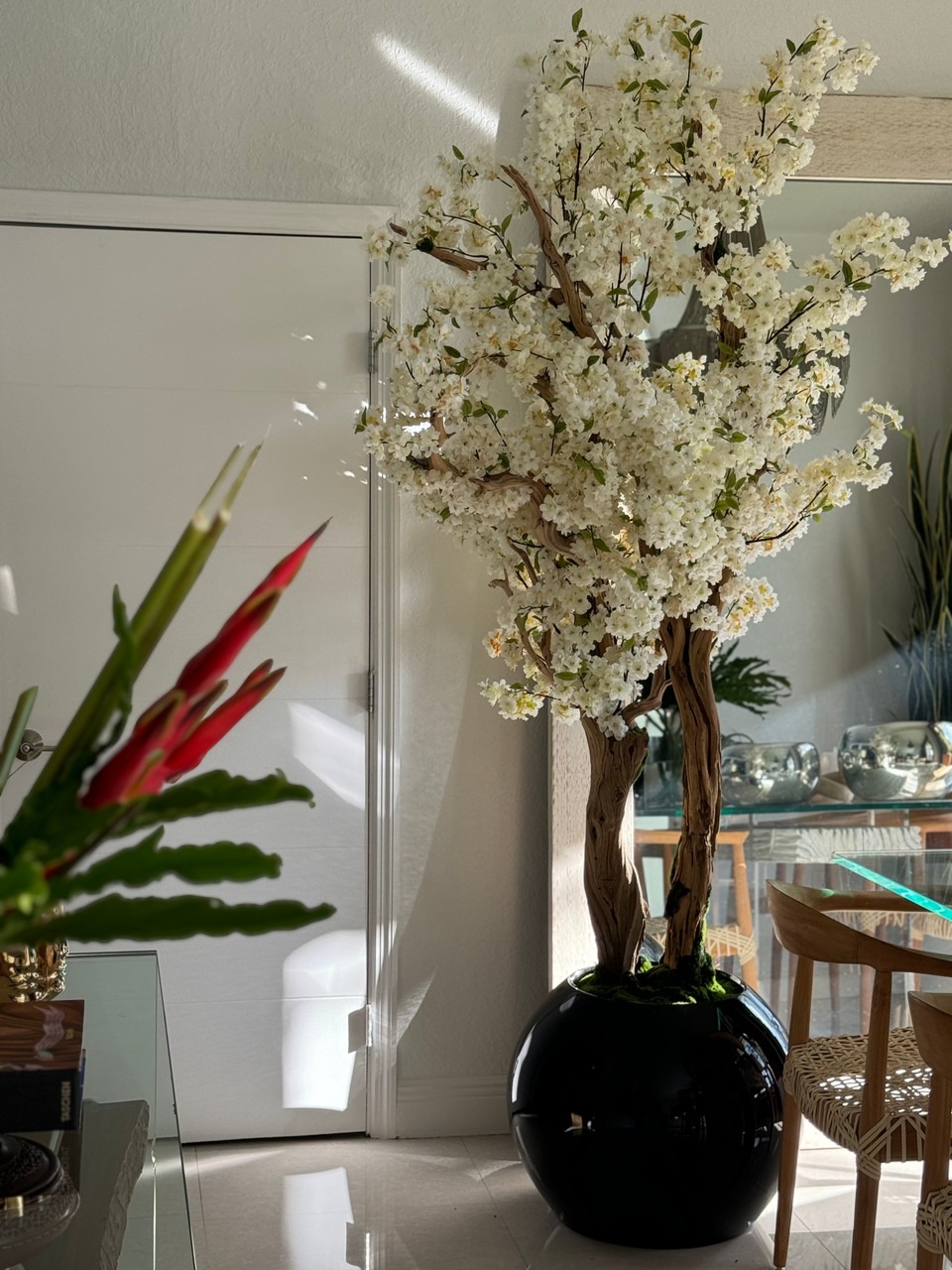 Cherry blossoms are a symbolic flower of the spring, a time of renewal, and the fleeting nature of life. Anchored in our glossy black 24″ globe vase which showcases a basic spherical shape, only with a modern twist. The full globe shape is the quintessential mix of traditional and contemporary styles as the round planters easily compliment any space around the home, garden or office. Its size and shape provide a perfect canvas for a our large white cherry blossom tree. Each tree is a one of a kind, flowers are placed by hand by our skilled artisans onto large wood trunks of California mountain wood. This bouquet of elegant white cherry adds a fresh and stylish touch to any room.