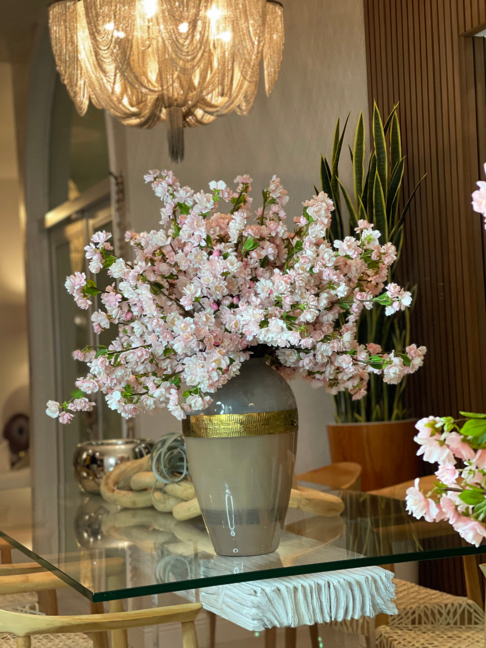 This bouquet of elegant pink cherry a adds a fresh and stylish touch to any room. The branches are presented in a our goddess glass vase, anchored in illusion water and are the perfect decorative accent for a large coffee table or dining room console.