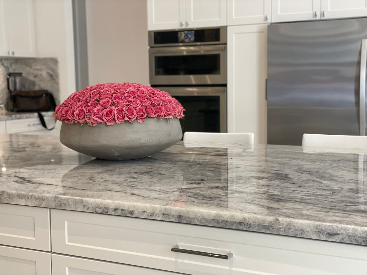 Beautiful, romantic and as realistic as you can possibly get, these pink stem-cut roses are perfectly arranged in our light weight “concrete” bowl – an oversized bowl featuring lightweight fiberstone construction giving it a concrete look. Nothing says “romance” quite like the look of roses. This beautifully hand crafted half topiary carries over 60 real touch pink roses. The topiary itself is impressive and is an ideal choice to adorn your next candlelight dinner, your home entryway, dining room or living room table, or anywhere you want a timeless flower arrangement.