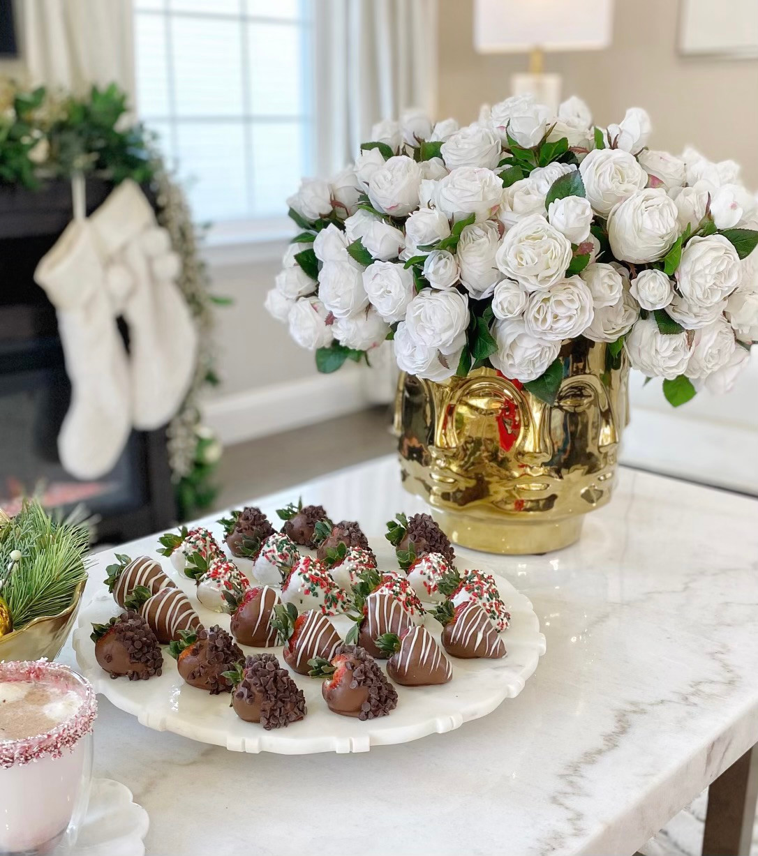Our Polished Gold Visage Vase with exquisite White English Roses is beautifully crafted. It’s a 360 degrees show stopper guaranteed to be a conversation piece. An ultimate luxury statement to any coffee table, console, vanity, or kitchen counter.
