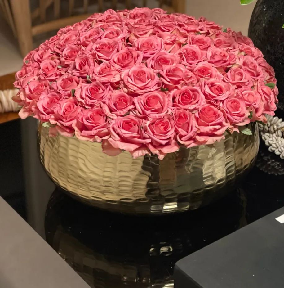 Beautiful, romantic and as realistic as you can possibly get, these stem-cut roses are perfectly arranged in our Roberi gold bowl. Nothing says “romance” quite like the look of roses. This beautifully hand crafted half topiary carries over 80 real touch roses. The topiary itself is impressive and is an ideal choice to adorn your next candlelight dinner, your home entryway, dining room or living room table, or anywhere you want a timeless flower arrangement.