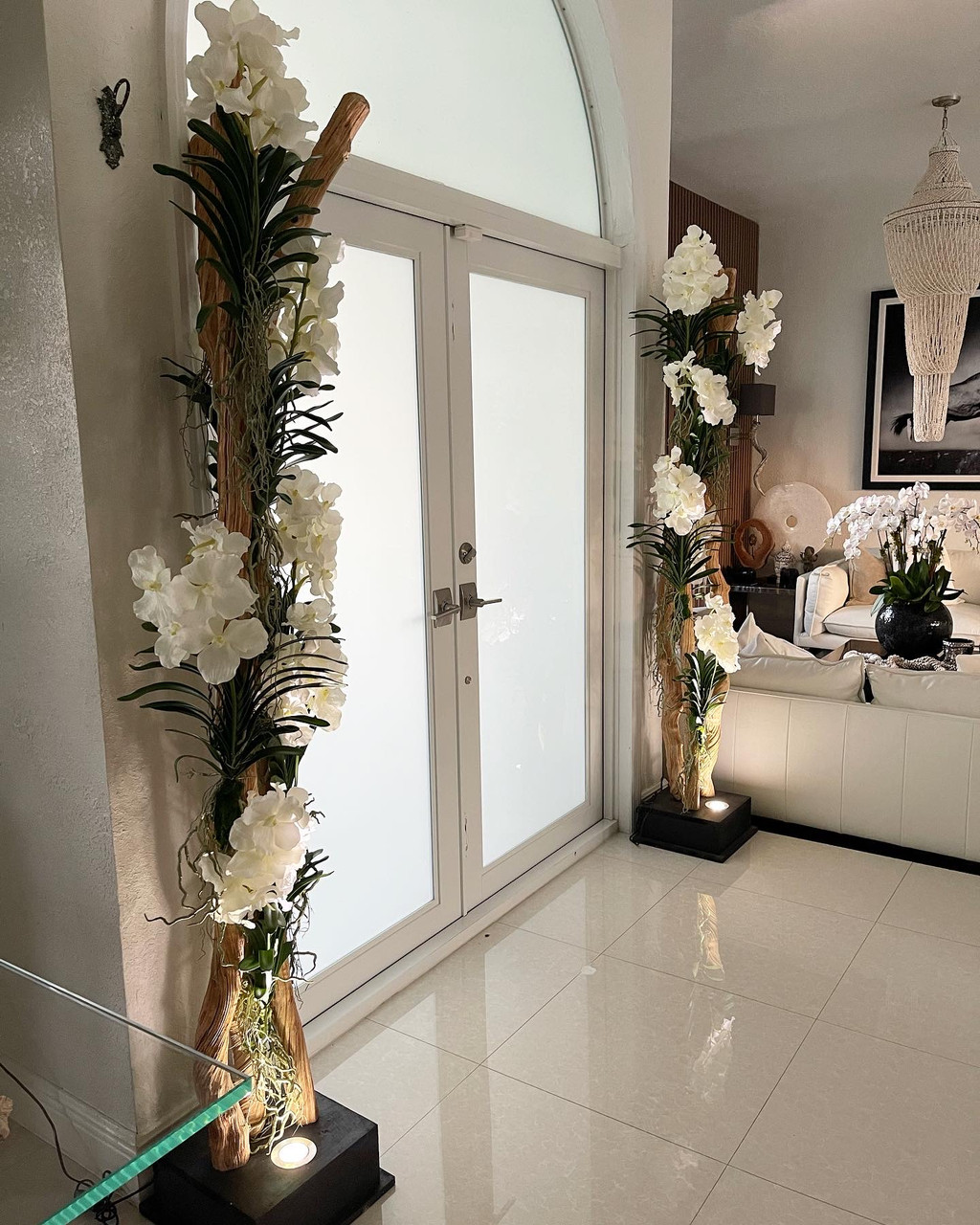 This beautiful and seductive Liana Sculpture Floor Lamp adorned with white Vanda orchids is an absolute eye-catcher and a wonderful unique addition to any room. The LED spot light on the base bathes the liana wood and orchids with warm light, igniting a cozy and sexy atmosphere. This is a beautiful sculptural piece to enjoy during the day as it transforms into a statement piece at night. The base consists of a solid wood panel, which adds an extra touch of elegance.