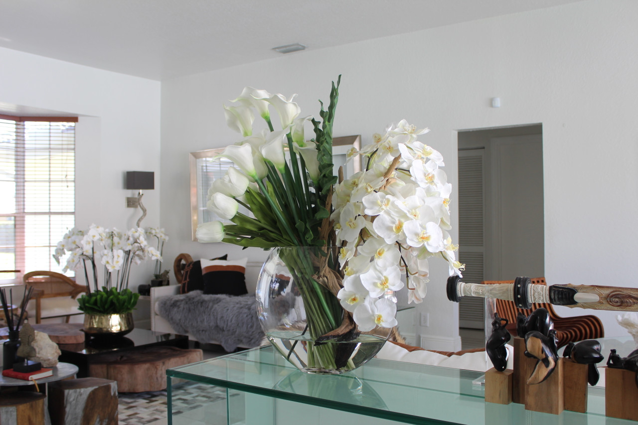 Moon vase 16″ with a mixed bouquet of white calla lilies, white tulips, orchids, philodendron leaf and sandblasted ghost wood anchored in our illusion water.