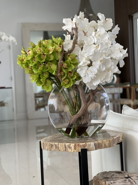 Our popular 16″ crystal glass Moon Vase with an arrangement of green cymbidiums, white vandas, sand blasted grapewood anchored in our illusion water.