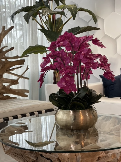 Graceful and exotic, the orchid has symbolized integrity, nobility, and luxury for centuries. Our enduring, bright pink phalaenopsis arrangement captures the artistry and spirit of natural orchids. It’s prized for its profusion of perfect blooms. Vertical bamboo stakes, broad green leaves, and a genuine moss base add to the realism of this arrangement. Set in our metal bowie bowl, a rounded silhouette and textured pattern finish, that is cast from aluminum, then polished and electro-plated for a gold finish, it makes an elegant tabletop accent. Display a pair for extra-lush sophistication.