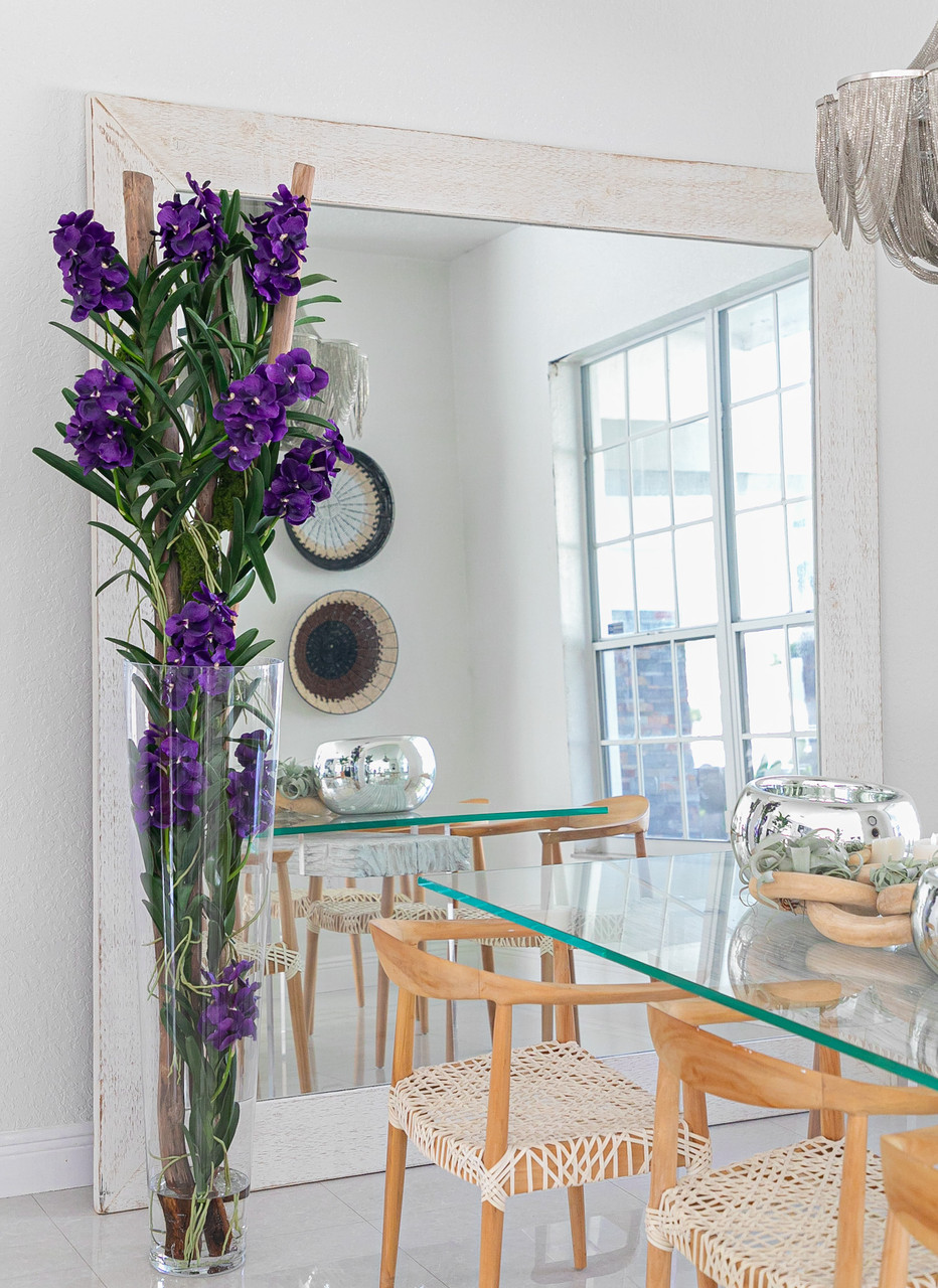 Purple blooms have made the Vanda orchid a favorite among lovers of exotic flowers. But growing these gorgeous orchids can be tricky; they require bright light and humidity and tend to look best when left in one spot. Our enduring artificial Vanda orchids arrangement looks stunning anywhere—in any light or climate. Generously scaled, lush, and abundant, this arrangement features broad, true-to-life leaves anchored to a piece natural California driftwood. Adding to its beauty, the whole ensemble fits within a handmade voluminous tapered cylinder. Its translucent and clear glass adds to the realism of this statement piece
