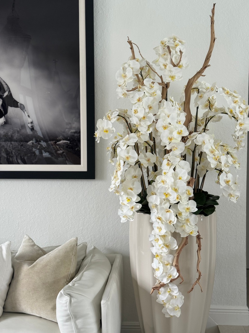 In this breathtaking arrangement, graceful white phaleanopsis orchids and driftwood intertwine, creating a truly captivating display that radiates refinement and grace. By juxtaposing the ethereal white orchids against the sleek, glossy black San Jose planter, a striking contrast of black and white is achieved. The delicate placement of the orchids, accompanied by their lush foliage and the inclusion of magnificent carliformoa driftwood, seamlessly brings this sculptural masterpiece to life, evoking a sense of realism that is truly awe-inspiring. Designed to leave a lasting impression, the San Jose planter adorned with cascading white orchids is not only a showstopper but can also be customized to suit different heights, planter sizes, and even colors, catering to the unique preferences of each individual.