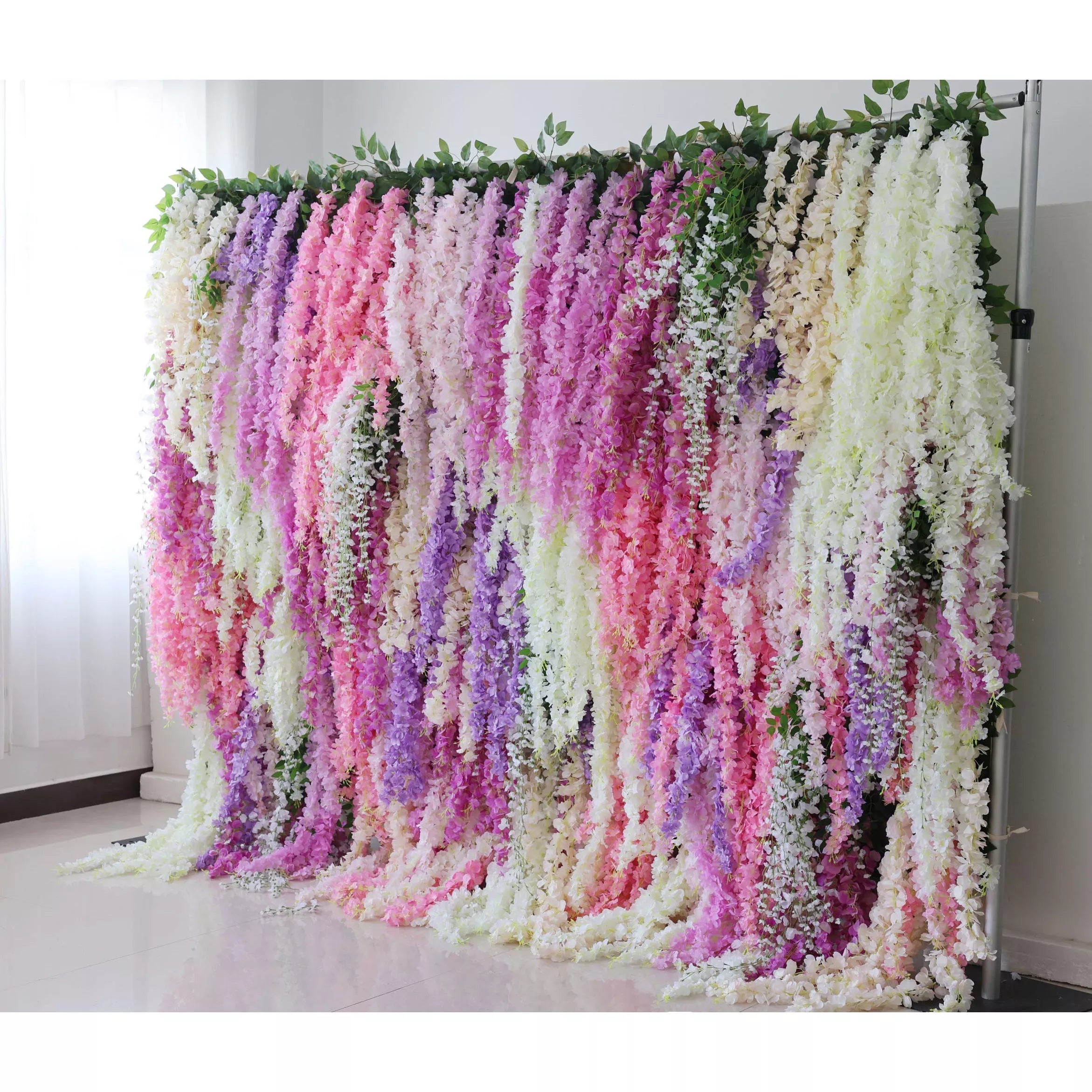 ValarFlowers Wisteria Wonderland: Step into a dreamy realm with this enchanting wall backdrop. Cascading wisteria in soft pastel shades of lavender, pink, and white create a serene and whimsical atmosphere.